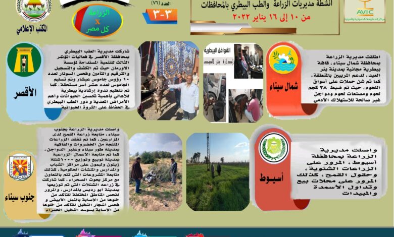 أصدر مركز المعلومات الصوتية والمرئية التابع لوزارة الزراعة واستصلاح الأراضي، والمكتب الاعلامي للوزارة، العدد رقم ٧٦ من اصدار “الزراعة في كل مصر” بالانفوجراف والفيديو، يوضح الجهود والانشطة التي تقوم بها مديريات الزراعة والطب البيطري بمحافظات الجمهورية خلال الفترة من ١٠ وحتى ١٦ يناير الجاري الجاري.