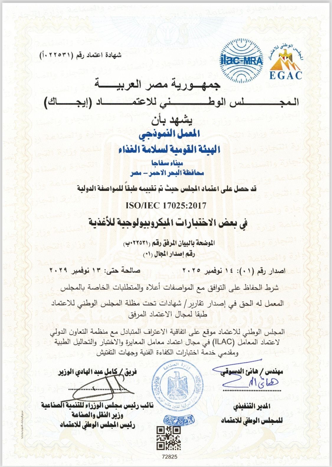 أعلنت الهيئة القومية لسلامة الغذاء عن حصول معمل سفاجا التابع لها على الاعتماد من قبل المجلس الوطني للاعتماد إيجاك – ( وفقًا للمواصفة الدولية ISO/IEC 17025 :2017 ) الخاصة بكفاءة معامل الفحص والاختبار، وذلك في إطار جهود الدولة المستمرة لتطوير منظومة سلامة الغذاء ورفع كفاءة البنية التحتية للمعامل.