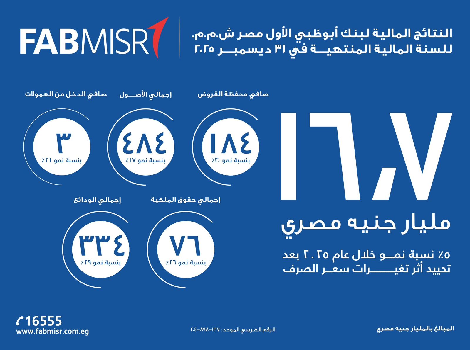وبحسب النتائج المالية، ارتفع إجمالي الأصول بنسبة 17% ليصل إلى 484 مليار جنيه مصري، فيما نمت محفظة القروض والتسهيلات الائتمانية بنسبة 30% لتصل إلى 184 مليار جنيه مصري.
