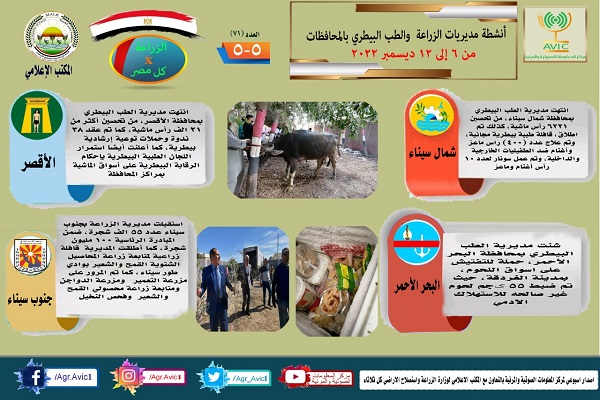أصدر مركز المعلومات الصوتية والمرئية التابع لوزارة الزراعة واستصلاح الأراضي، والمكتب الاعلامي للوزارة، العدد رقم ٧١ من اصدار: “الزراعة في كل مصر” بالانفوجراف والفيديو، يوضح الجهود والانشطة التي تقوم بها مديريات الزراعة والطب البيطري بمحافظات الجمهورية خلال الفترة من ٦ وحتى ١٢ ديسمبر الجاري.